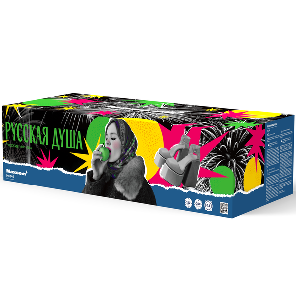 • зеленый хвост, парчовый треск • красный хвост, зеленый, красная вспышка • красный хвост, красный треск • зеленый хвост, зеленый треск • желтый хвост, желтый треск • синий хвост, синий треск • синий хвост, хрустящая серебряная рыбка В финале одновременный залп с золотыми трещащими пальмами.